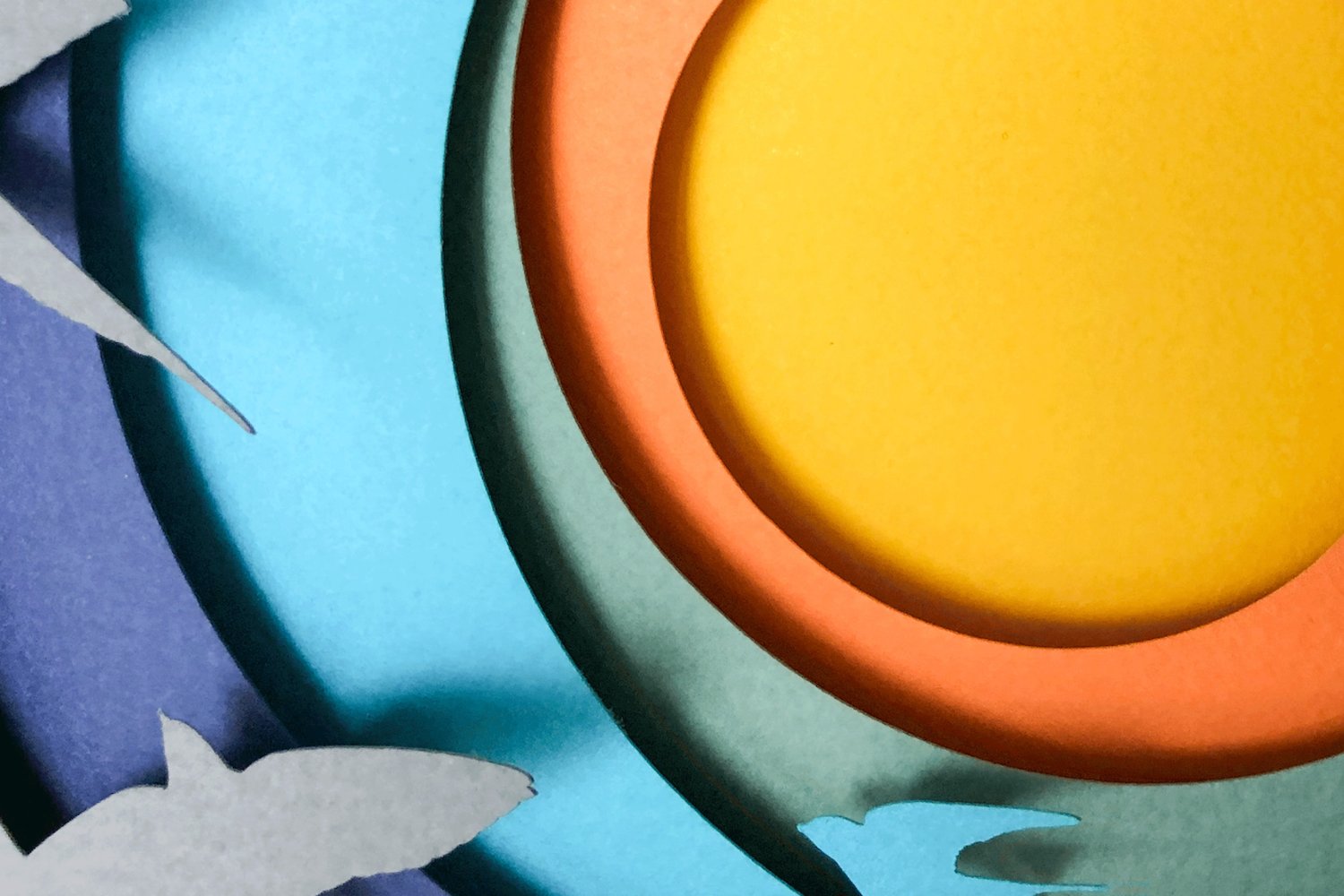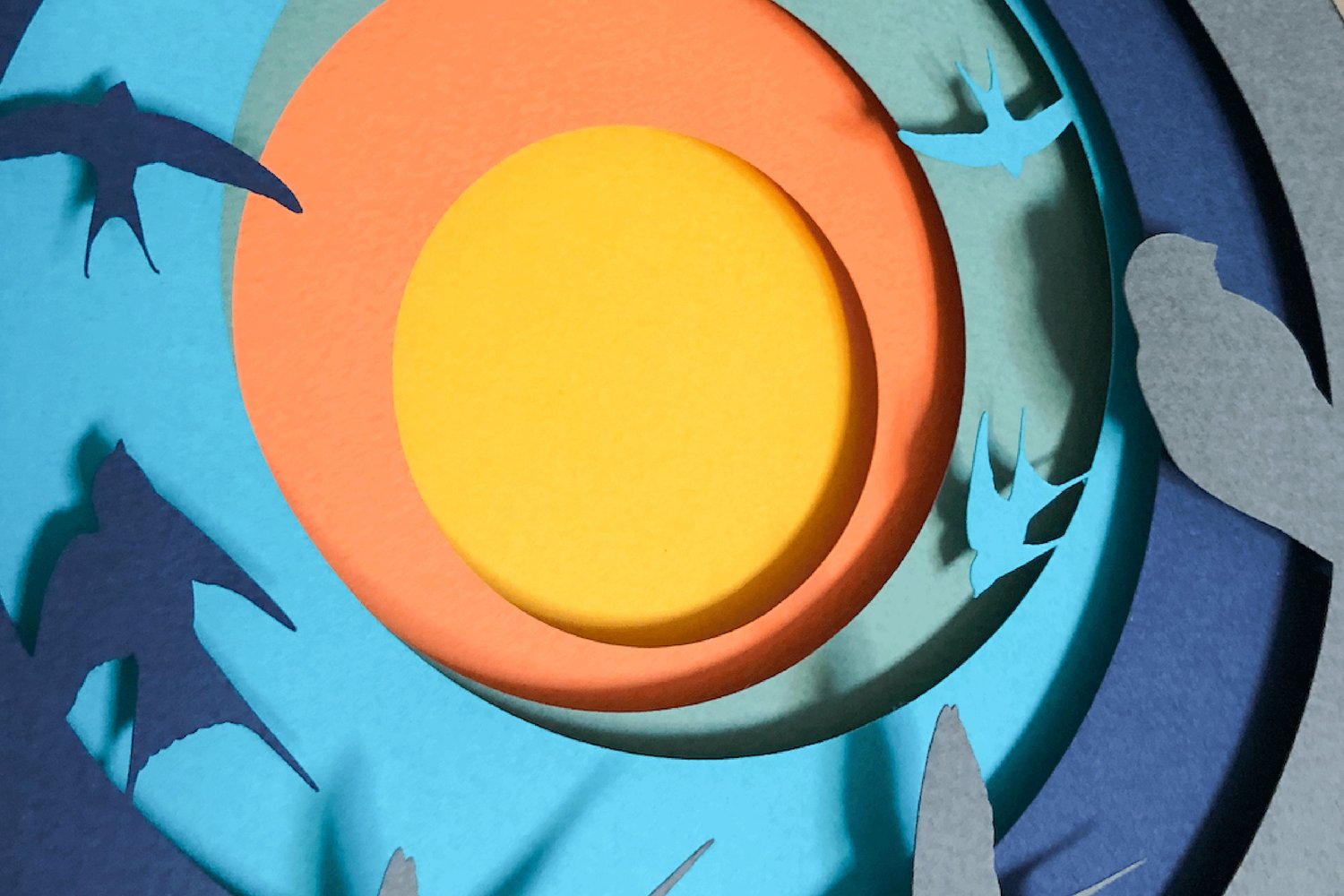 This design has 6 layers which combine together to show swallows in flight around the setting sun.