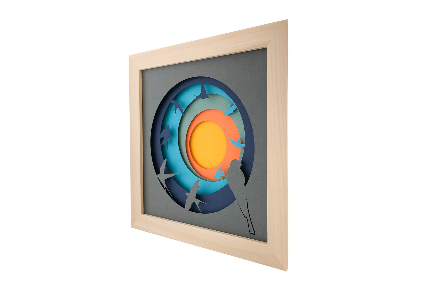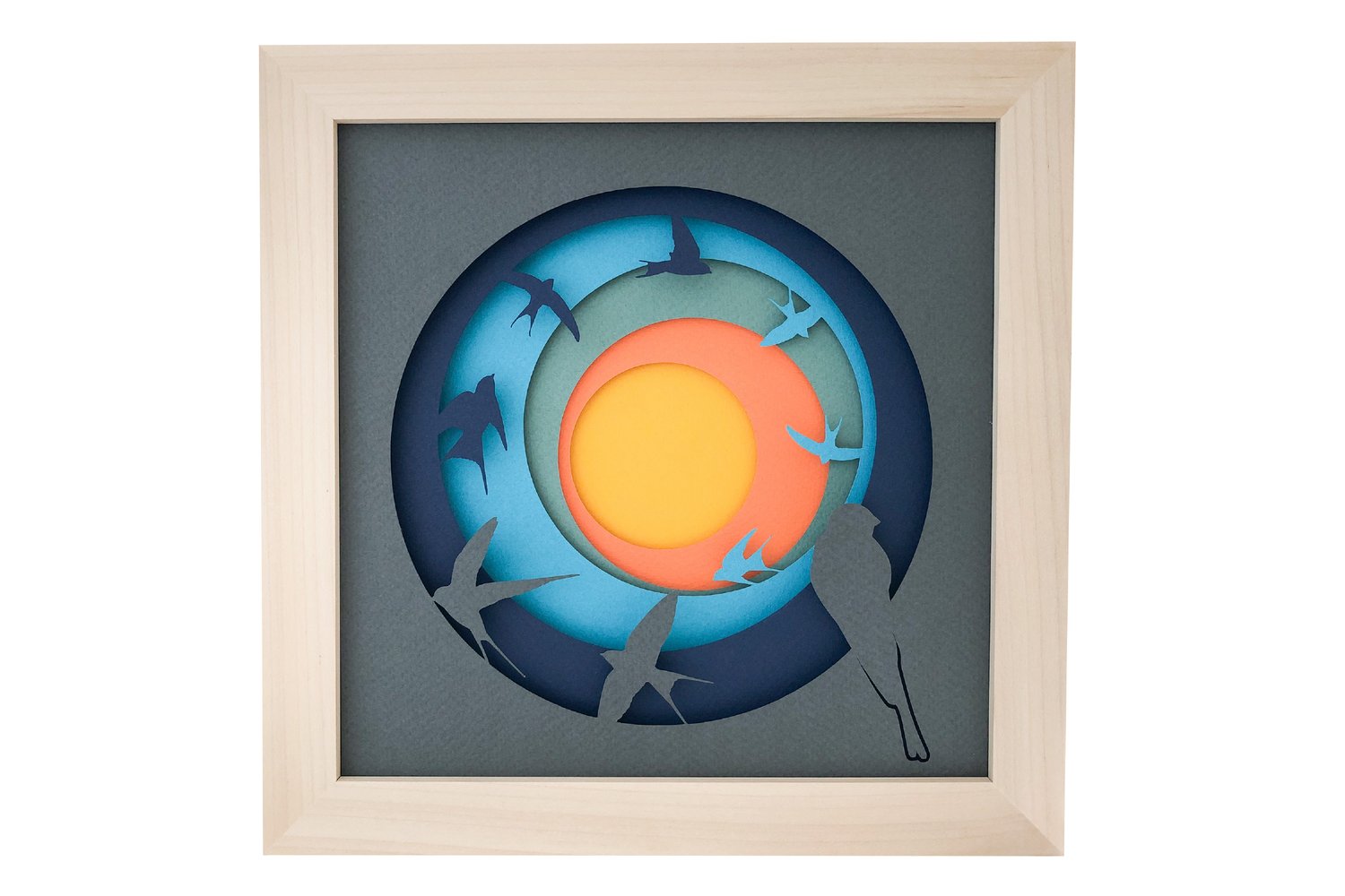 This ‘Swallows at Sunset’ swallow shadow box is an abstract paper cut design representing animals interacting with nature. Watching barn swallows swoop and dive in the early evening is one of my favourite sights in late Summer. That is what inspired me to design this shadow box paper cut.