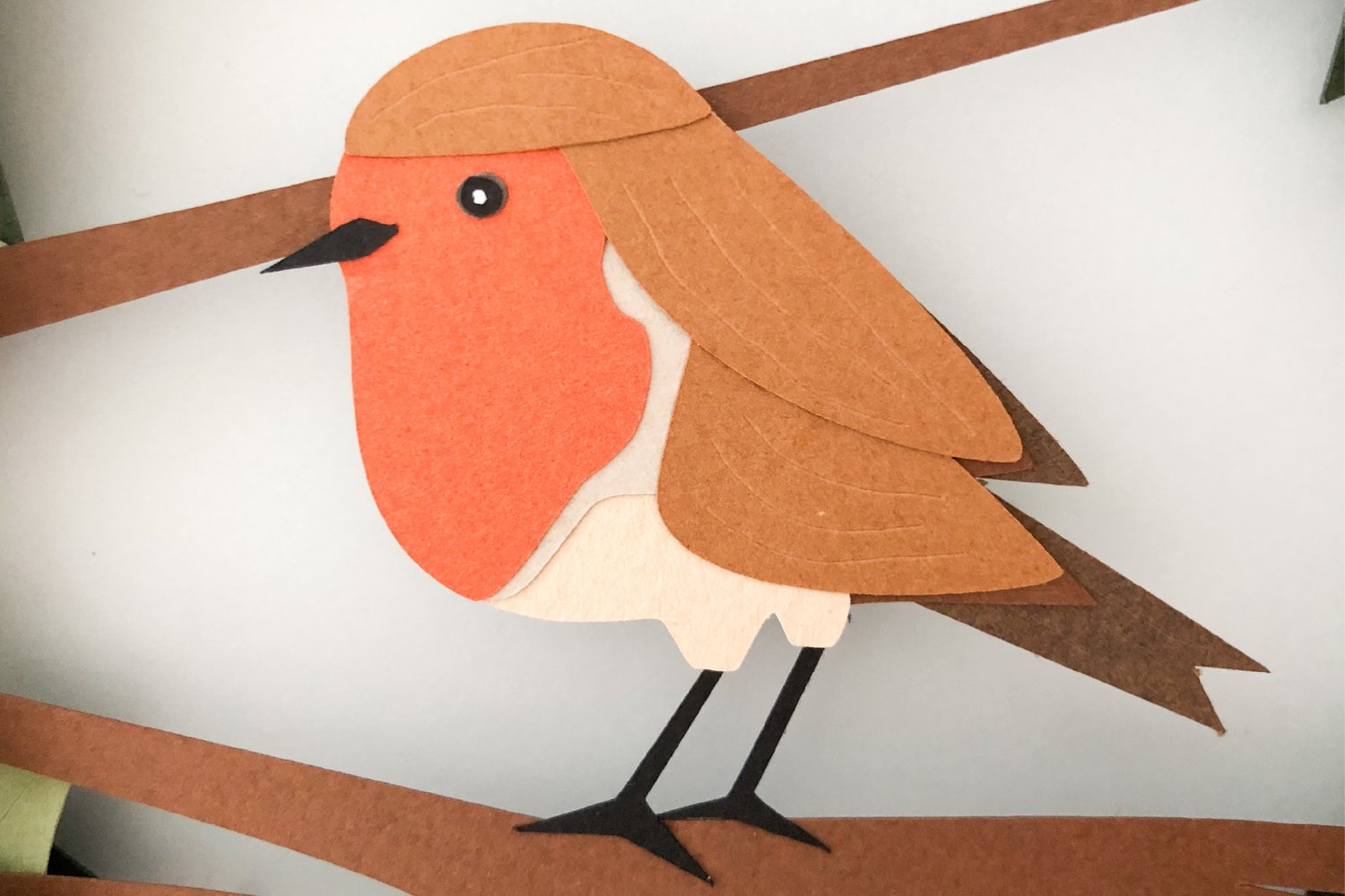 The shadow box has 6 separate layers and a collage of a robin to make up the whole picture.