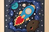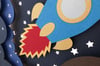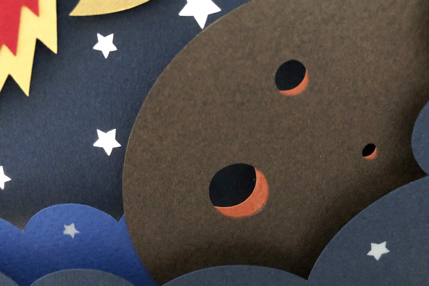 A rocket ship shadow box 3D paper cut template. This colourful rocket ship is zooming through outer space past planets and stars. This shadow box design looks great as decor in a child’s space-themed bedroom. The shadow box is designed to have micro LED lights at the back so they make the background stars shine. However it will look great without the lights too.