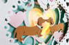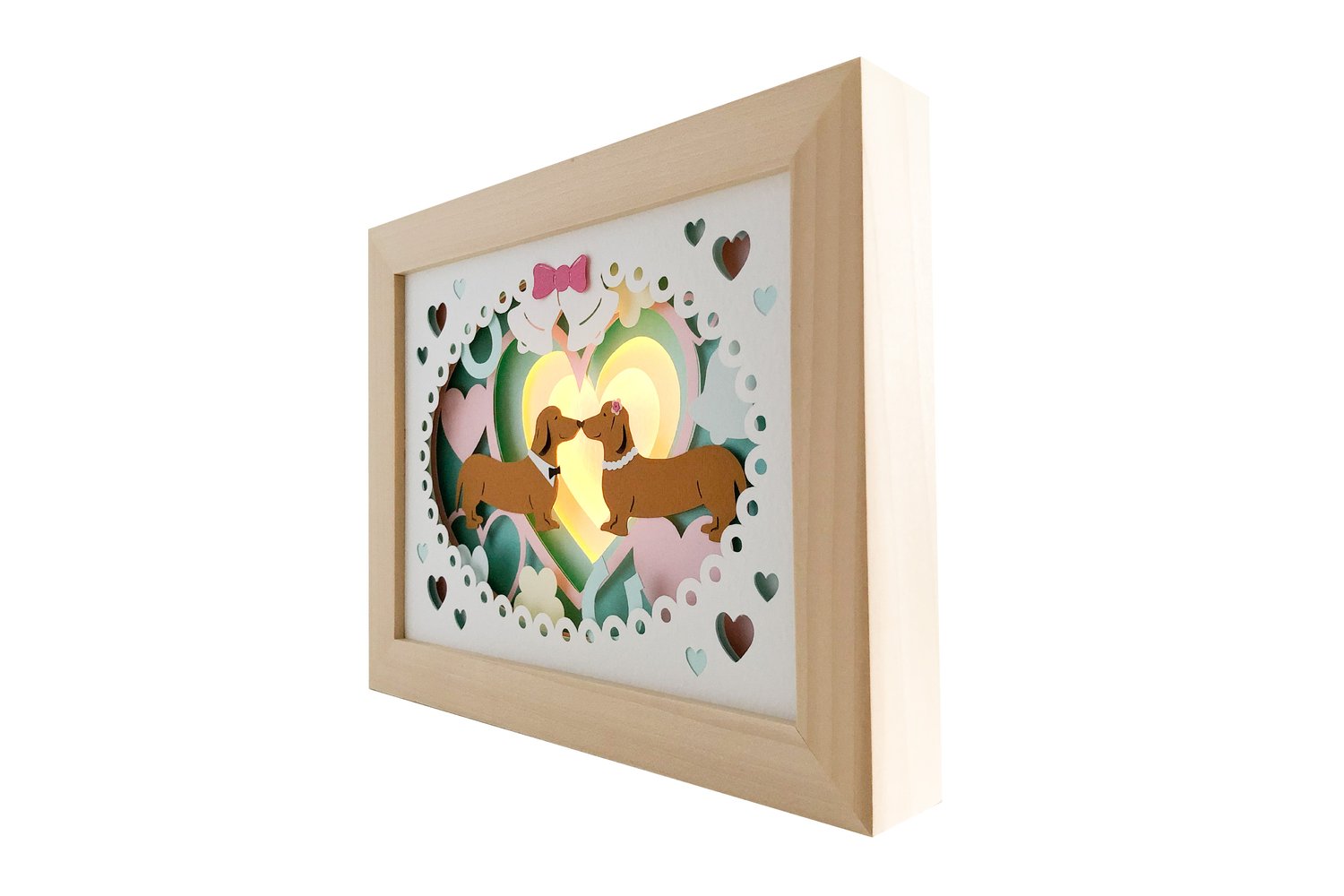 This paper cut shadow box is designed to have micro LED lights at the back so they shine through the background heart to give a warm fuzzy feeling. Although, as the photos show, it looks equally as good without the lights.