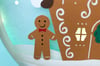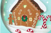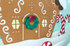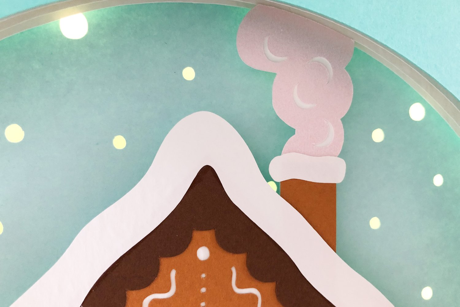 A light up Christmas gingerbread house paper shadow box template. The house is surrounded by snow and Christmas sweets, including candy floss smoke coming from the chimney and a gingerbread man who probably lives there.