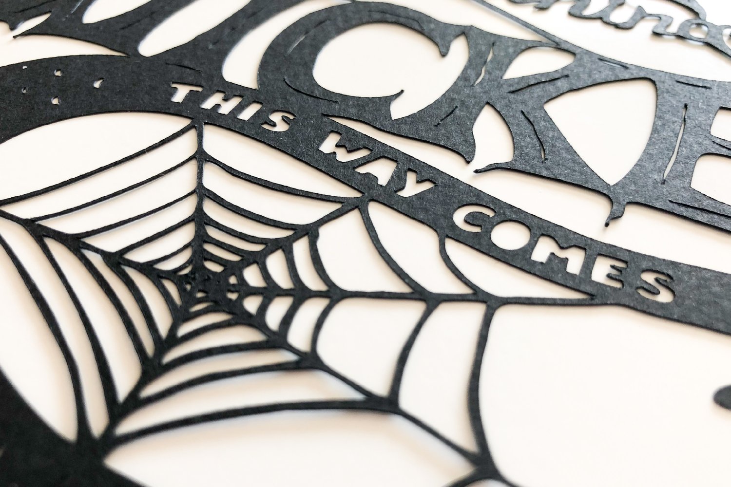 This spooky paper cut design is based on my original hand drawn sketch. It features the wording 'Something wicked this way comes' and is my homage to Halloween. The sketch has been digitised and edited to make it suitable for a cutting machine as well as cutting by hand. Of course this design could be cut from vinyl instead of paper, but please be aware that weeding may be intricate.