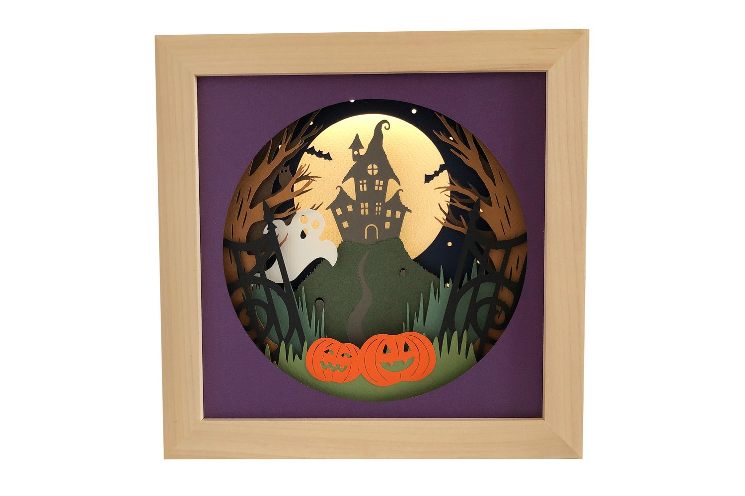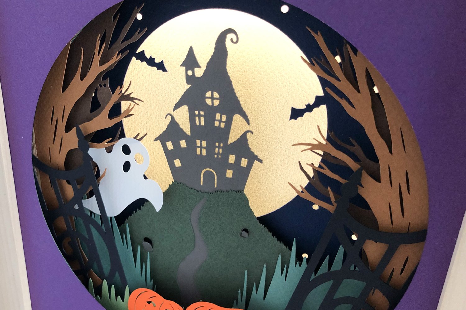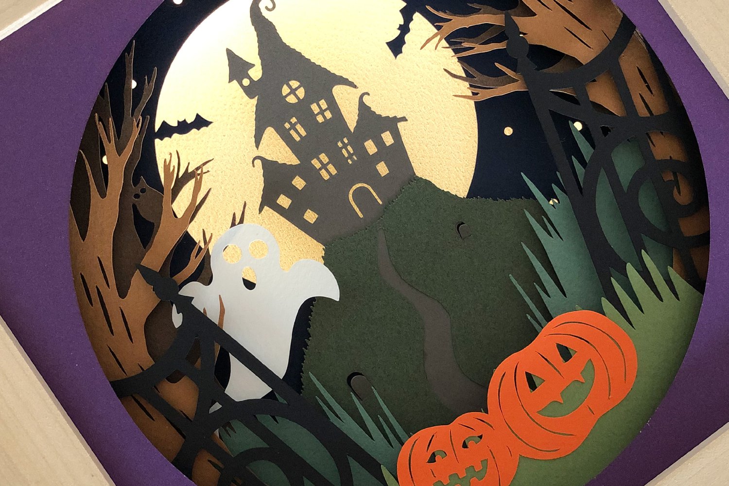 This Haunted House shadow box design is a great DIY project for you to create a Halloween theme decoration for your home. The shadow box has 12 separate layers and the moon is created using micro LED fairy lights in between the last two layers.