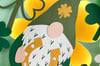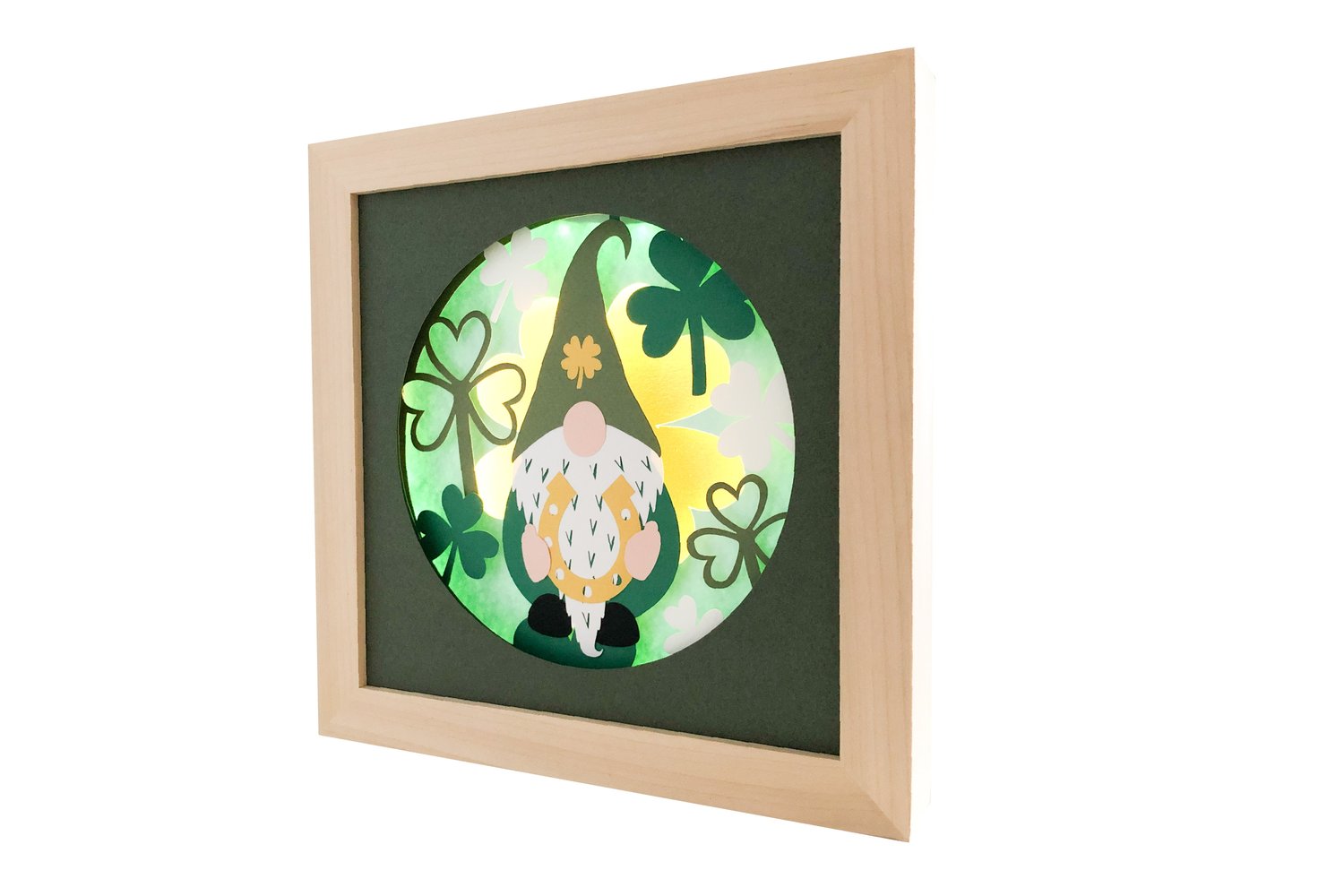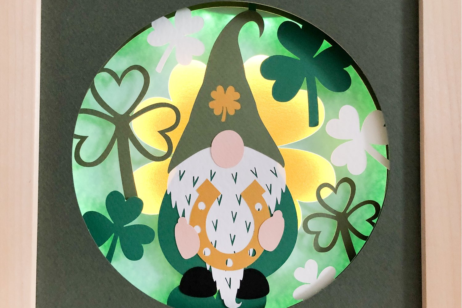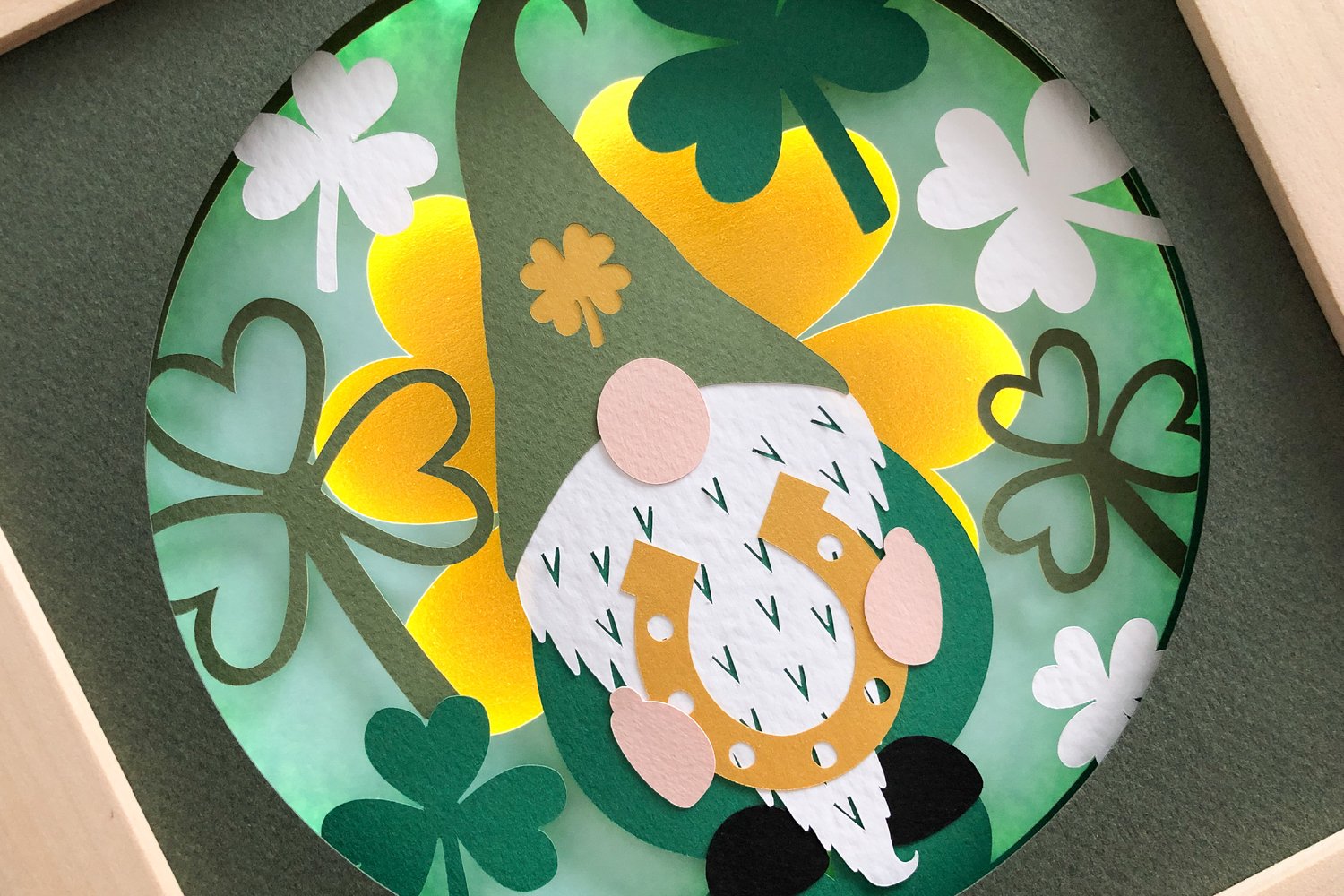 A St Patrick's Day gnome, surrounded by shamrocks, paper cut shadow box template. This cute Saint Patrick's Day gnome is a lucky chap. Not only does he have a four leaf shamrock shining on him and in his hat, he's also clutching a golden horseshoe.