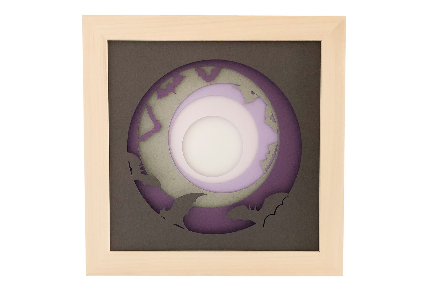The shadow box has 6 layers which interact together to show bats in flight around the moon.