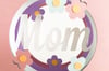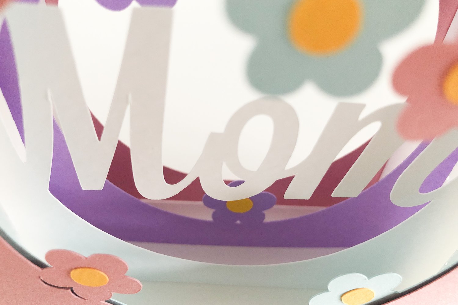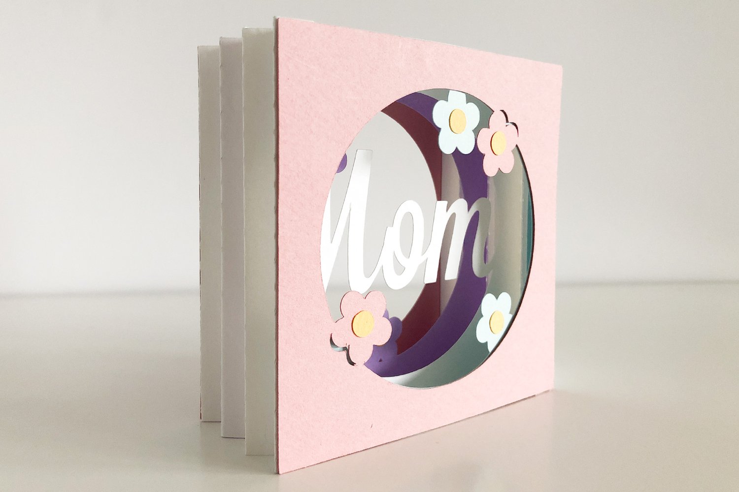 A pretty shadow box tunnel card featuring flowers around the paper cut wording ‘Mom’, ‘Mum’ or ‘Mam’.