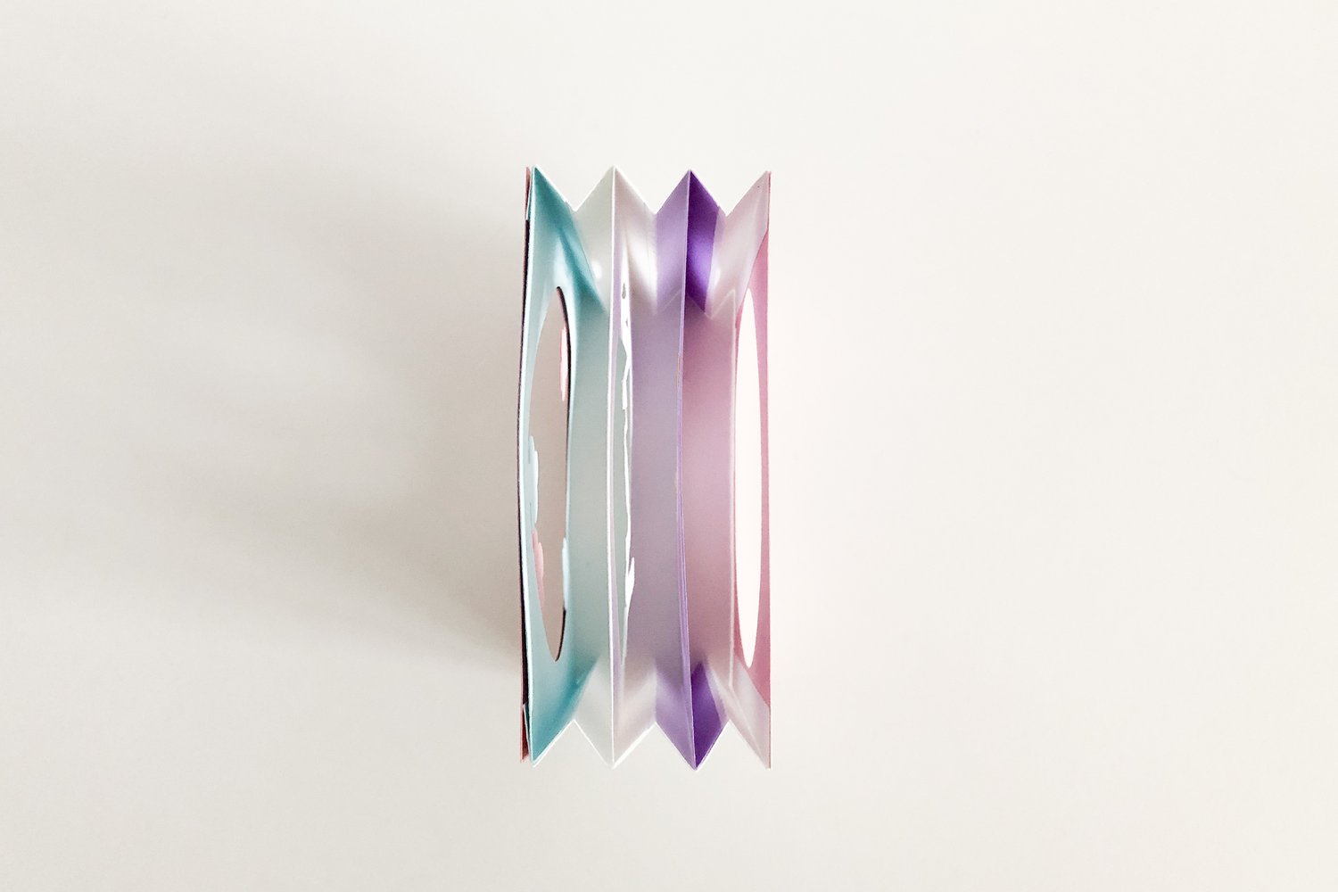The finished card measures 4” x 4” and is approximately 1.5” deep when open. The card can be collapsed down to fit with the 4” x 4” greetings insert in the envelope.