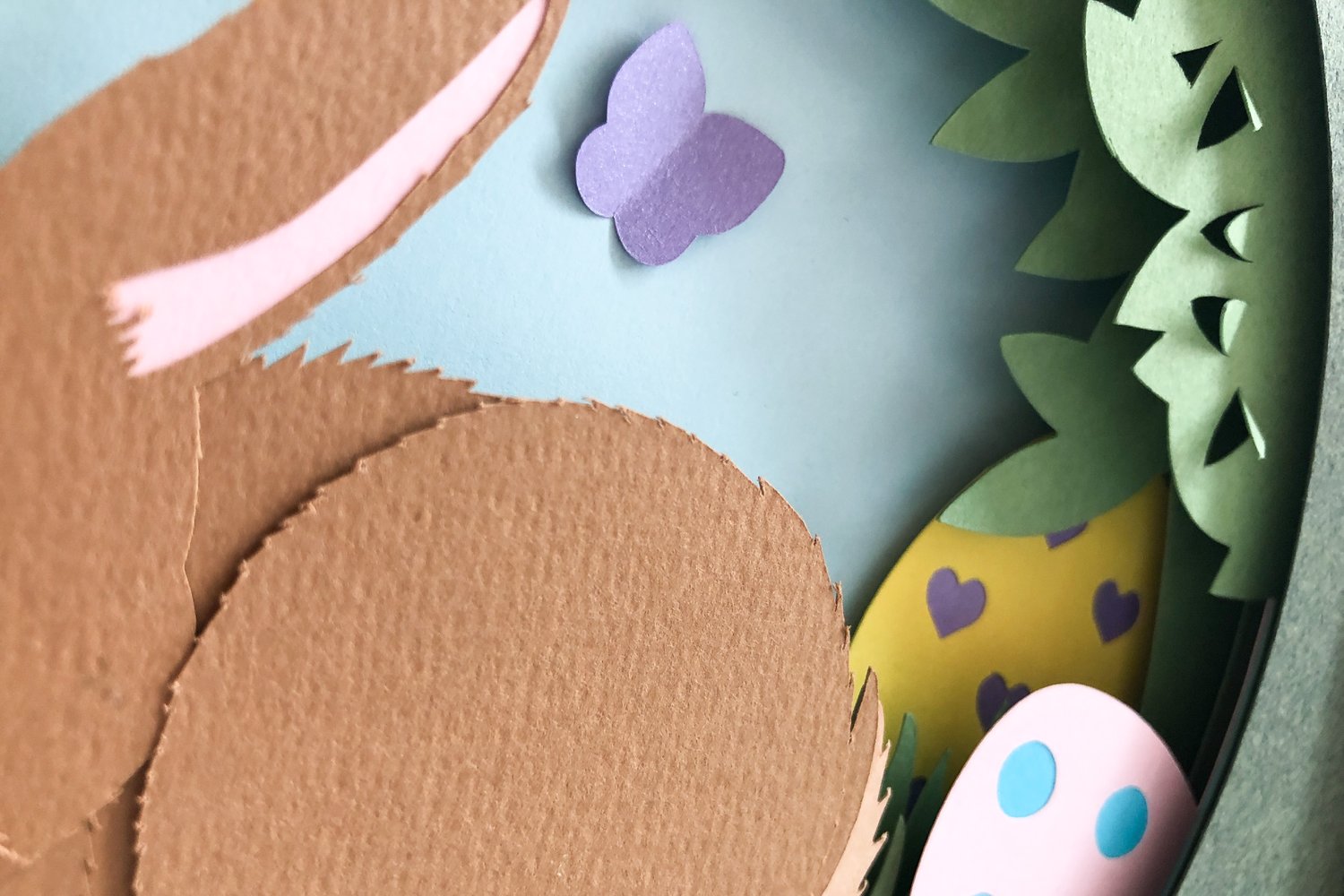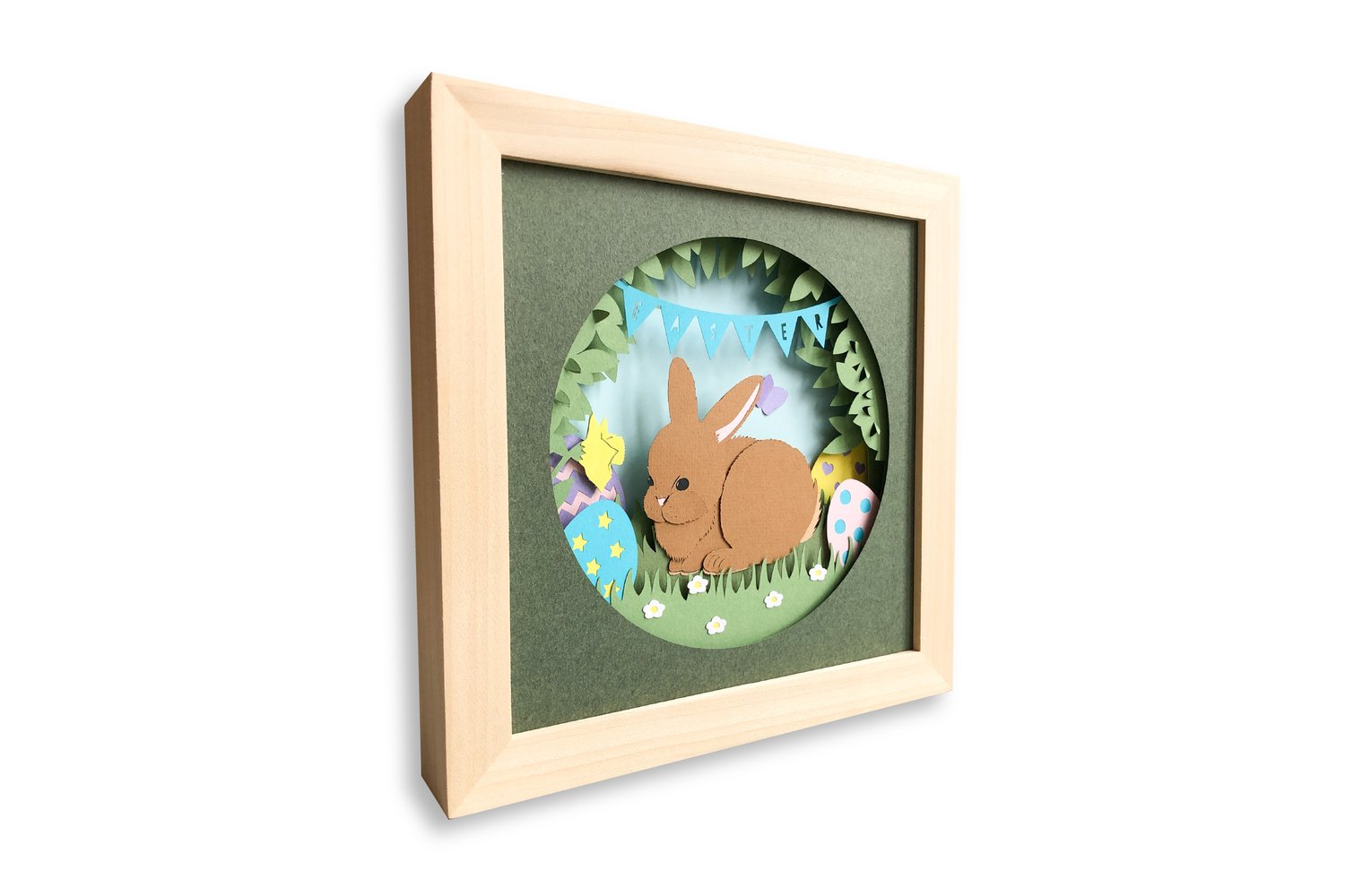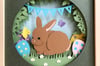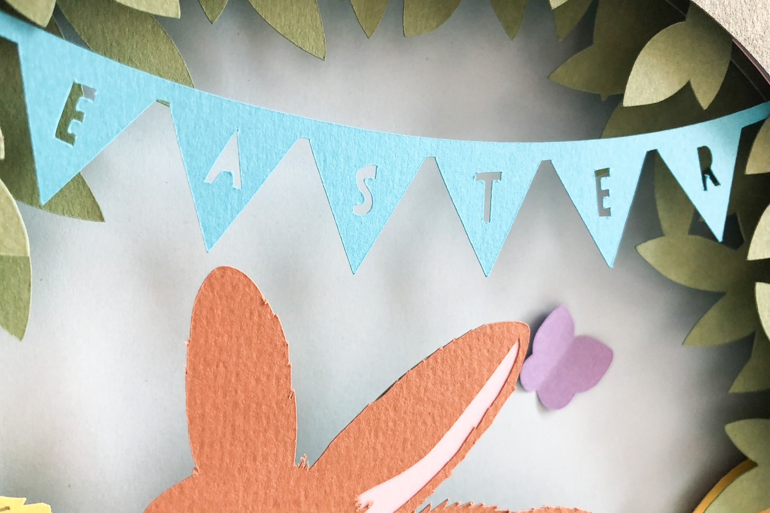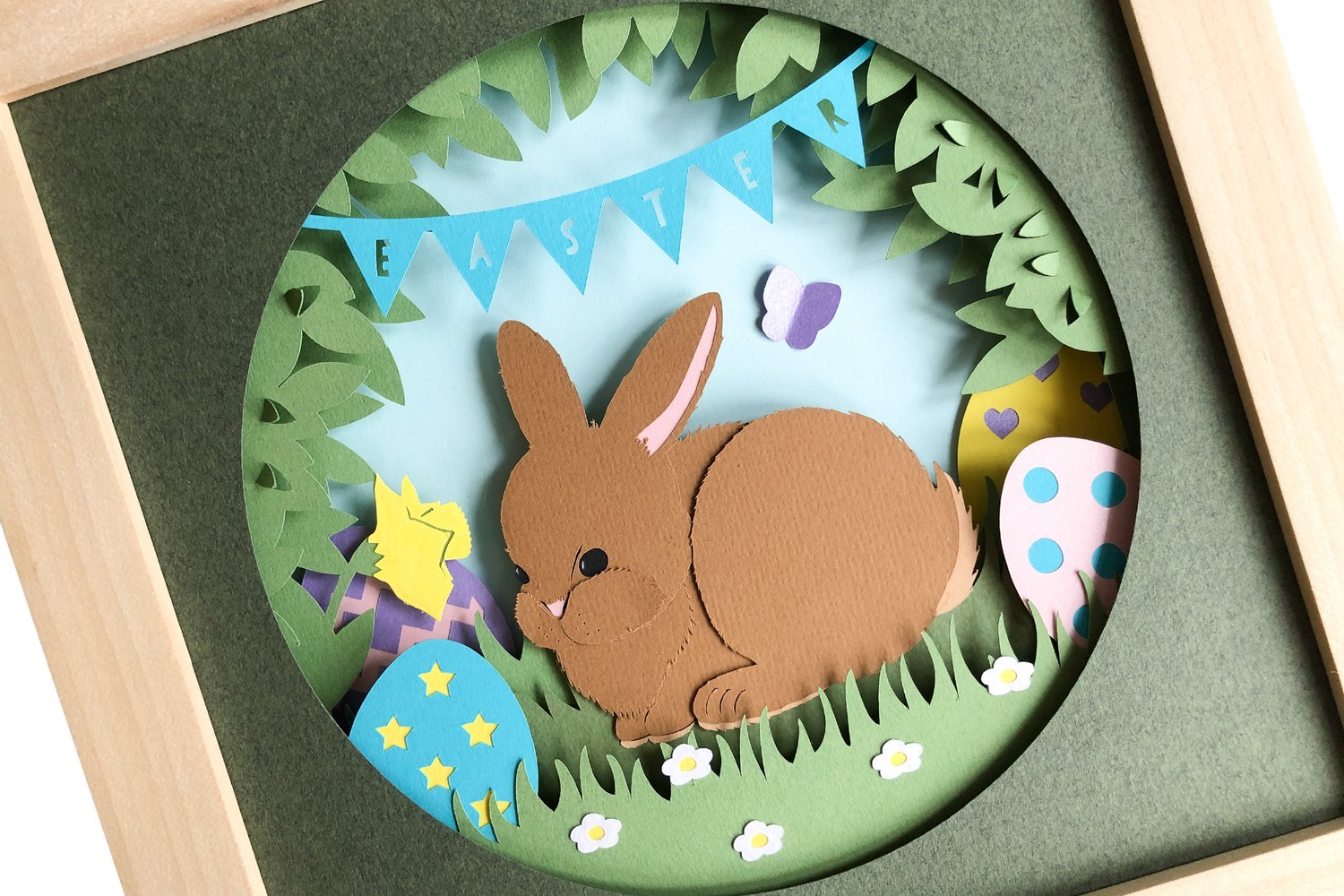This Easter bunny and Easter eggs 3D shadow box paper cut is part collage and is made from several layers of coloured paper. It has a cute bunting banner displaying the word ‘EASTER’.