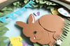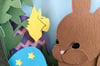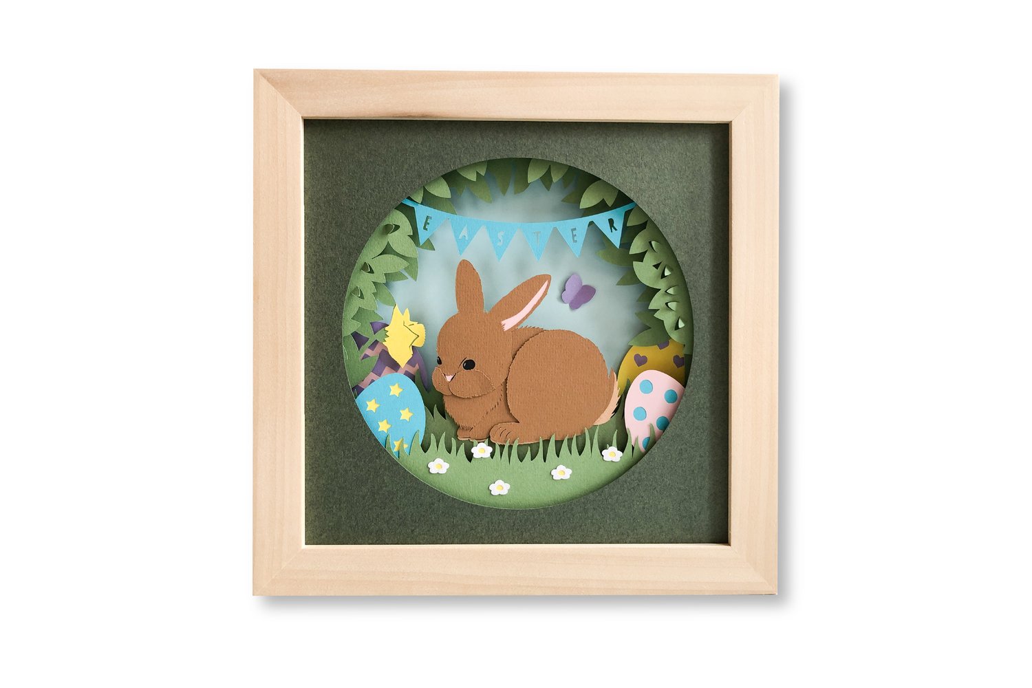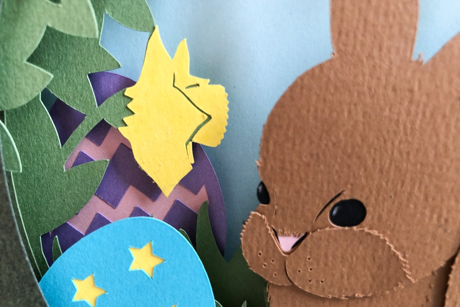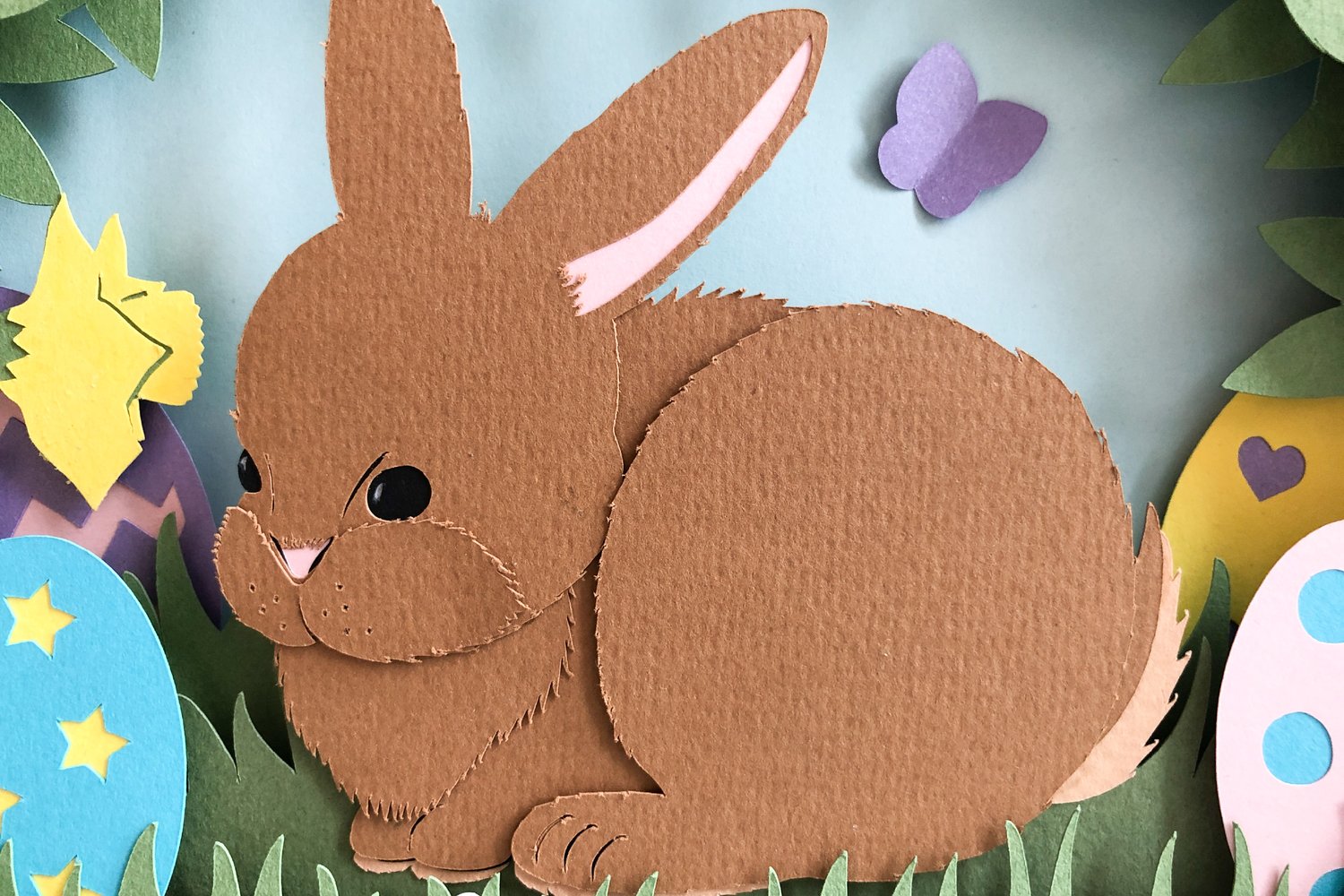 This Easter bunny and Easter eggs 3D shadow box paper cut is part collage and is made from several layers of coloured paper. It has a cute bunting banner displaying the word ‘EASTER’.